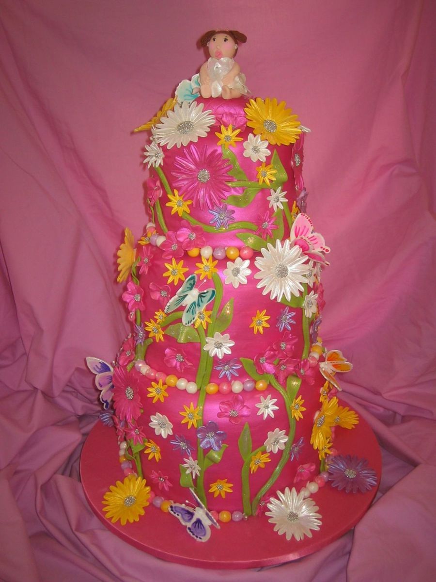 What an absolutely gorgeous cake!!!! I love the bright colors and all of the flowers!!! The butterflies are so sweet!