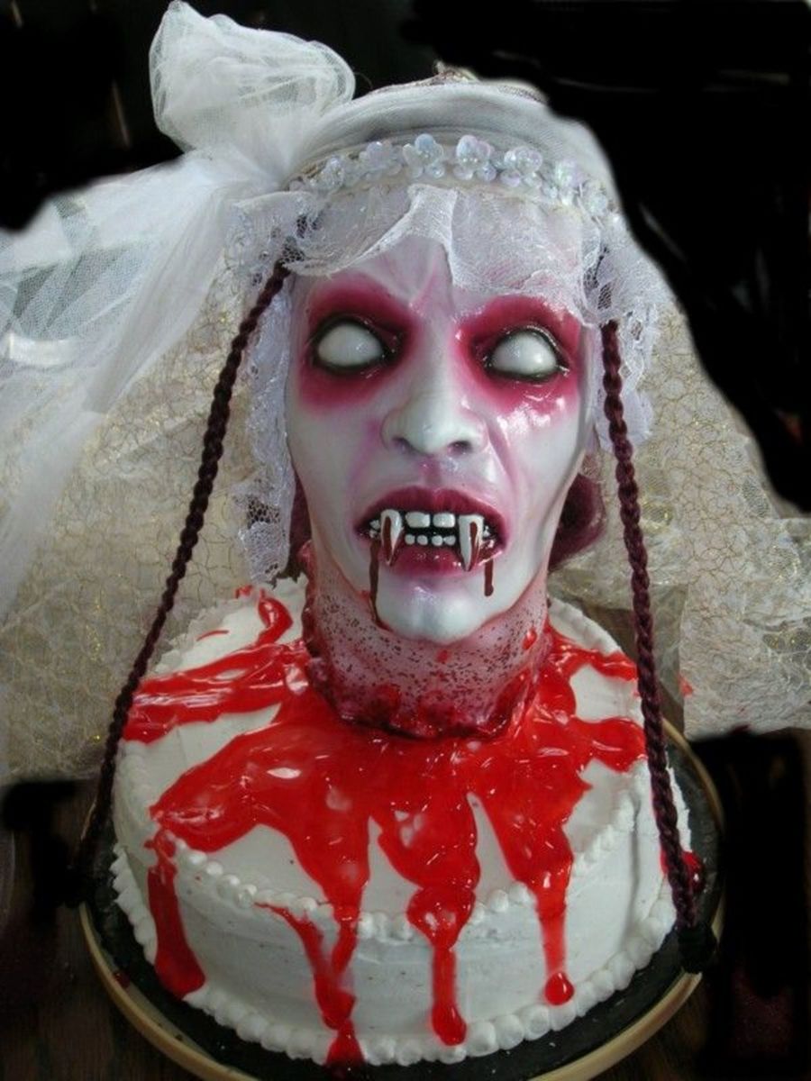 Two layer 9-inch round red velvet cake. Iced in Buttercream frosting with strawberry glaze as the "blood" topped off with a head I bought at the halloween store