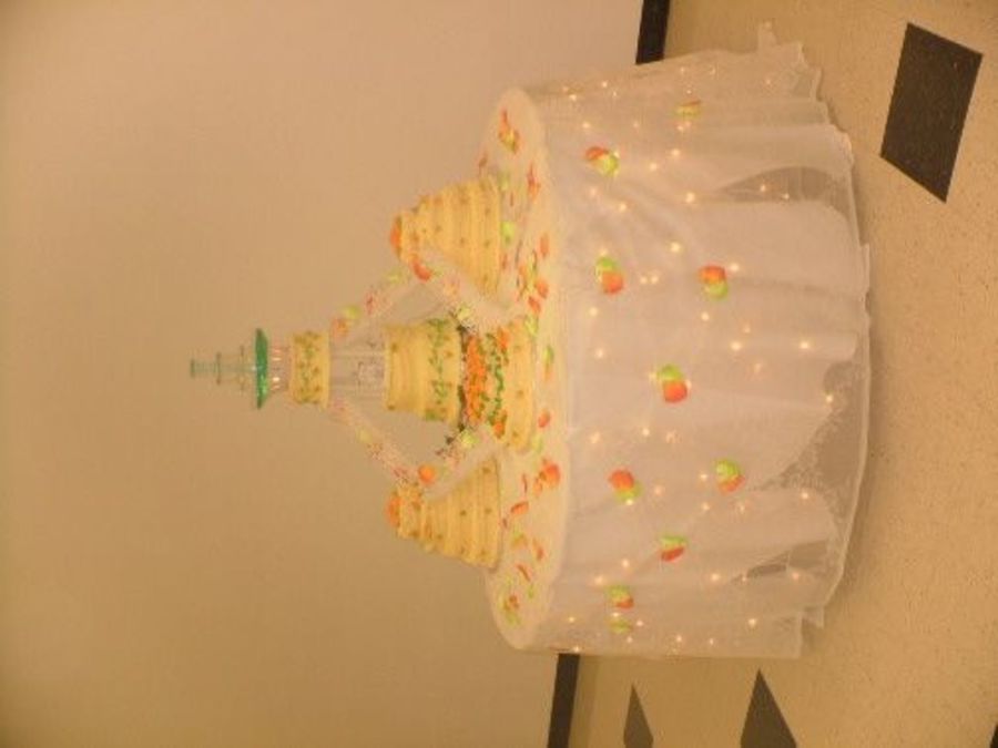 This is the biggest wedding cake I have ever done. The tiered cakes with fountain are all dummy cakes. And the side cakes and the middle heart is real. It fed 150 people. I used 6, 8, 12, 14 round pans and then for the heart cake I used 9 inch sitting ontop of the 12 inch round. All buttercream. No filling. I had a wonderful time making and designing this cake. The bride gave me full designing rights and she and her husband really loved it. I also decorated the table as well.