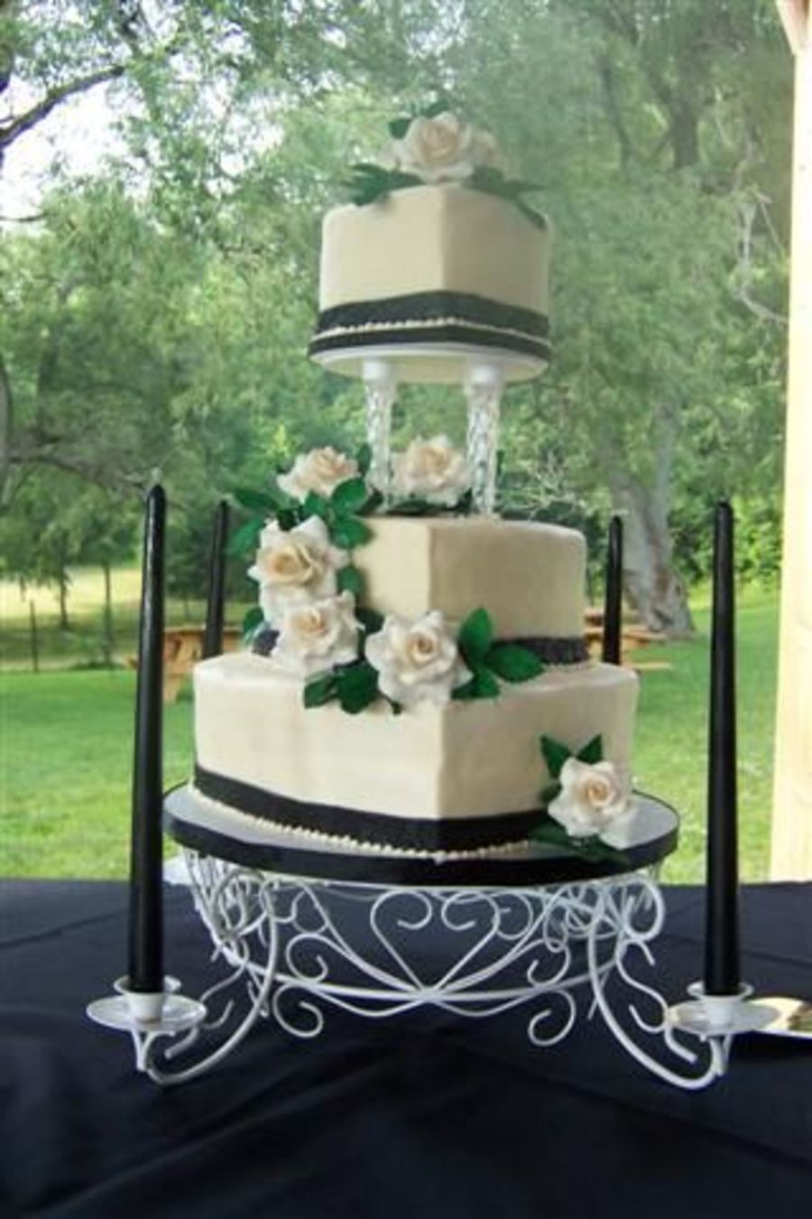 heart shaped cake on wiltons candlelight stand. the ribbon is black fondant the cake is iced in buttercream