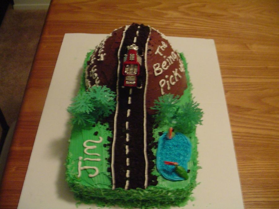 This was made for the owner of the software company I work at. The base was made out of butter yellow with vanilla frosting, the hill was devils food with milk chocolate frosting, shaved coconut around the border, the road was crushed oreo.