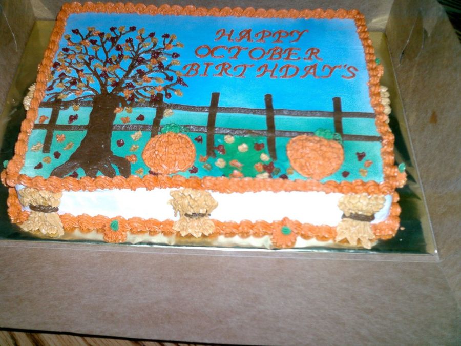 This is a cake for October birthdays at church. It is all buttercream. I enjoyed doing this one. The background is done with wilton color spray. My camera didn't pick up the green to well.