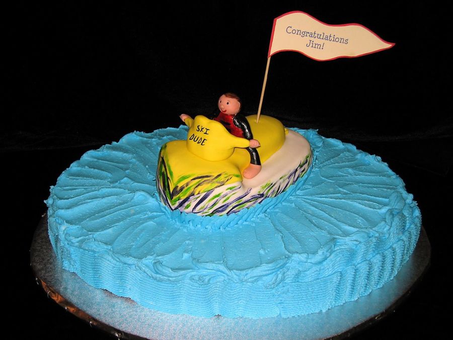 Jetski was carved from a loaf cake then covered with fondant and painted with gel colors. Rider was modeled from fondant and painted.