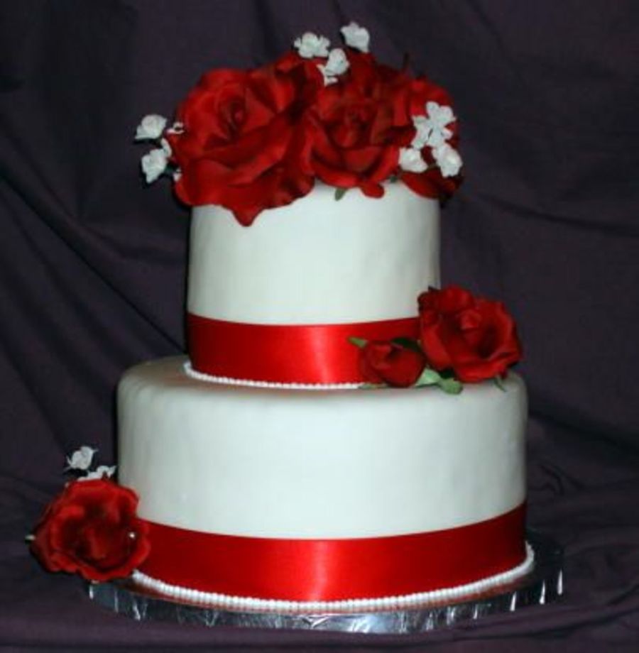 10" inch and 6"round cherry cake with buttercream filling with mmf and silk roses. ribbon trim....someone please give me some tips on mmf....I LOve working with it more than bc, but the last few times, I can't seem to get it right...it's either too dry or too sticky....guess I just need more practice!