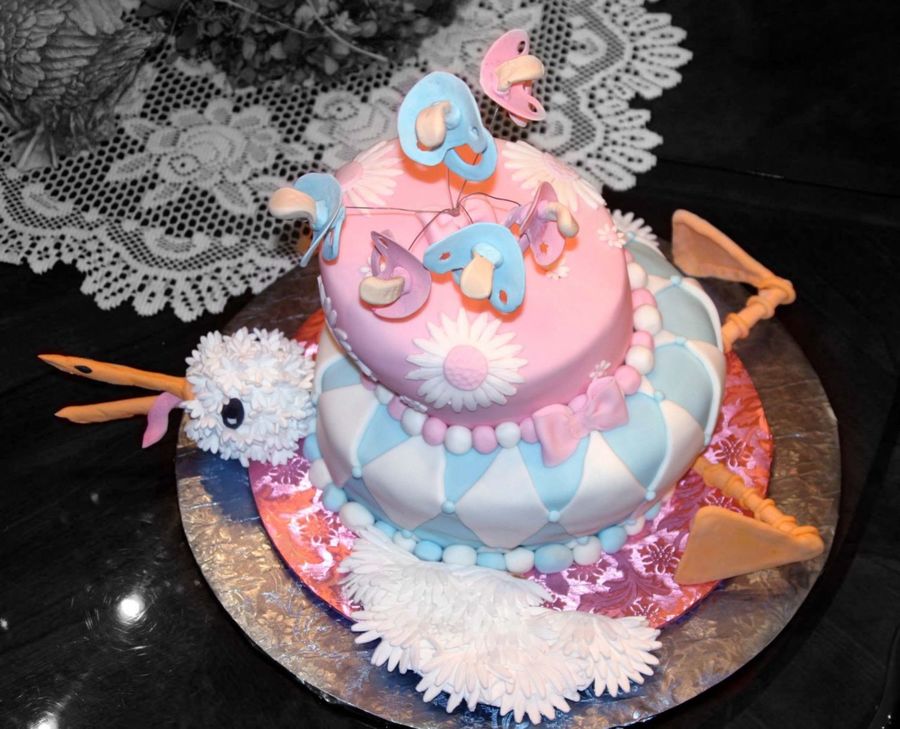 I lurve this cake. So unique. The stork is awesome and the pacifiers look so real! Very, very nice cake.