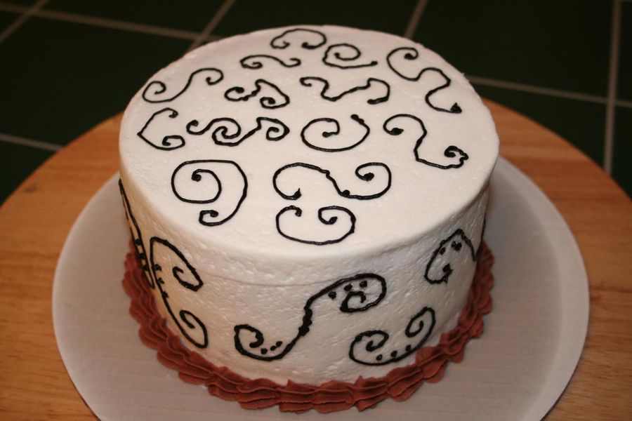 Dark chocolate cake with chocolate buttercream filling and decorations, buttercream frosting. This was my first time trying scroll work. I like how the sides came out, but am not happy with the top. This was given as a Thank you and the person loved it.
