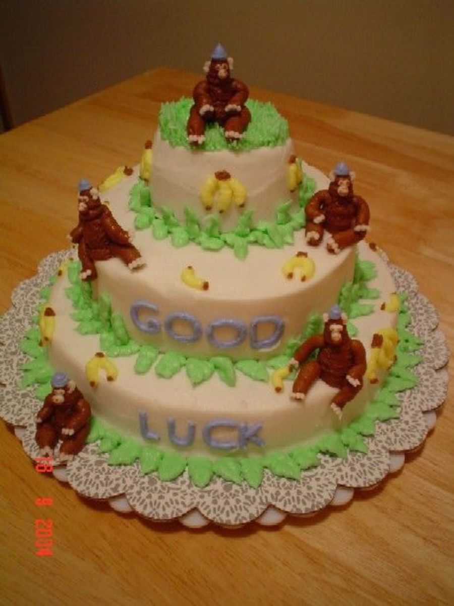 Thanks to Ladycakes for providing me with instructions on how to make monkeys. I couldn't find a tip 2A so I improvised by using a coupler to pipe the torso. I finished the cake, about an hour after we were supposed to be at the party. Yikes!