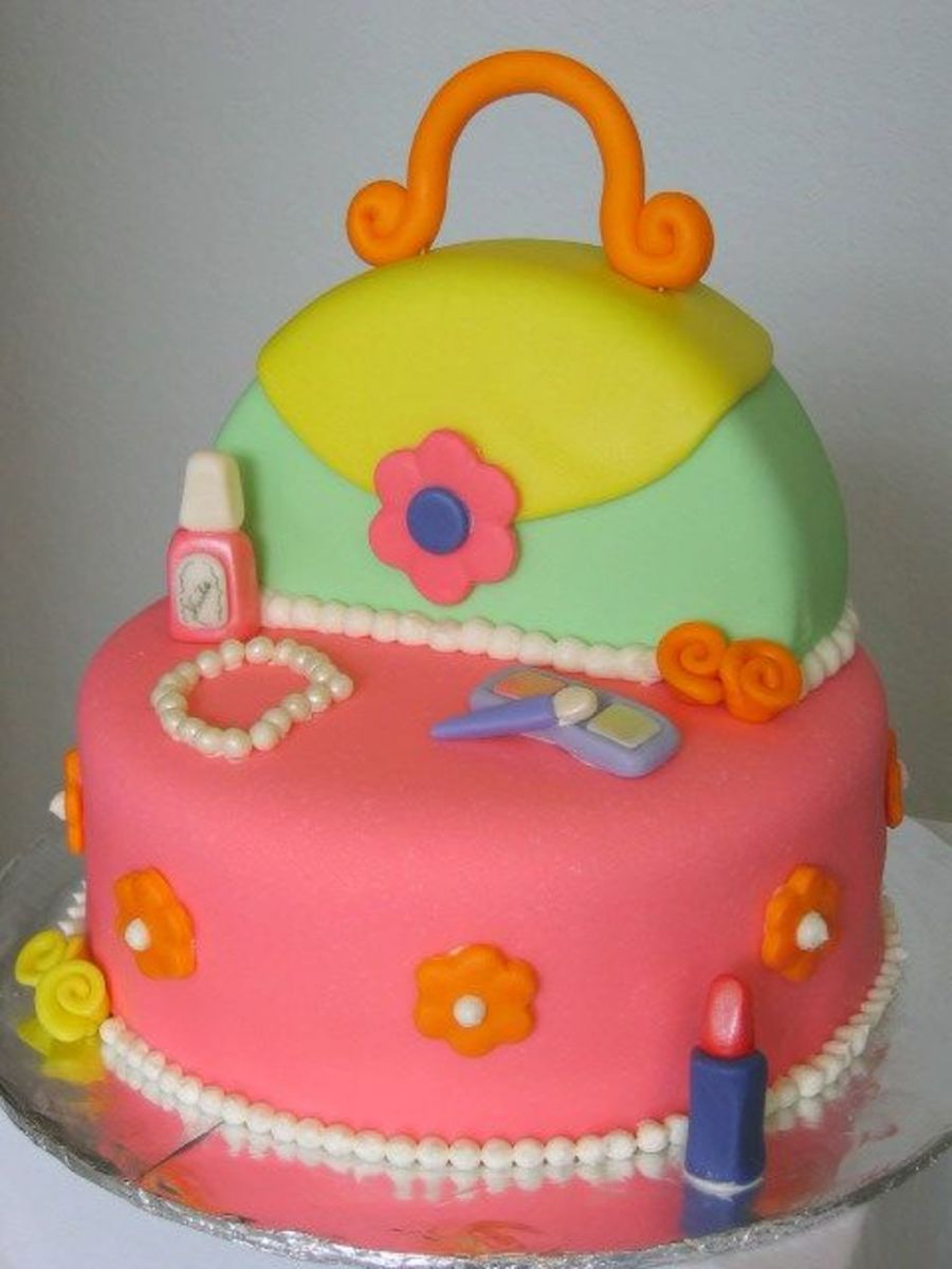 I made this cake for my daughter's friend 7th birthday as a gift. They are having a dress up party.fun! fun! I was inspired by many purse cakes in CC and was so excited to do it. The purse is an 8 round cut in half and the bottom is a 10 round. All accessories were made out of MMF. Enjoy!!