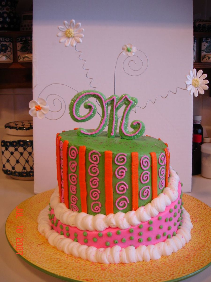 Thank you! I did make an oopsie, I meant to ice the top cake hot pink and the green M would have looked better, but I forgot and made the top green also. So I had to add the hot pink to the M to make it stand out better. Oh well, you learn something from every cake! :wink: Thank you for your comments! :D
