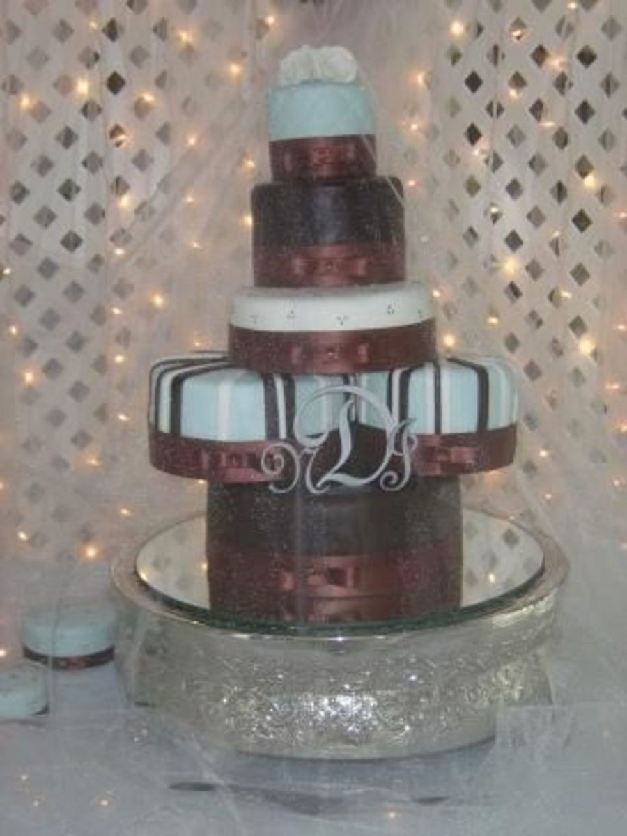 This cake was a challenge -- thanks to jdogga for the color scheme and kakekrafts for the design. I told my daughter to pick out a cake & she choose two to combine. Flavors (from bottom) are white chocolate raspberry, french vanilla, snickerdoodle, hummingbird, & red velvet (top 2 tiers). All iced with buttercream & covered with fondant. This was my first fondant wedding cake. It was a little lopsided, but it was outside & extremely humid here (Houston). My daughter loved it & that's all I wanted!