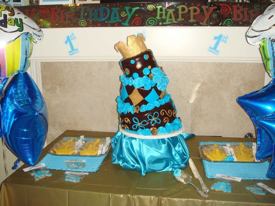 This was my son's first birthday cake. Top- tiramisu w/ bavarian cream filling, middle- keylim w/- cream cheese filling, bottom- chocolate w/ baavarian cream filling. Iced in cream cheese and covered in Chocolate MMF w/ MMF accents, g I spent all week on his cake and cookies and was about to cry when the cake topple over! This was my first attempt w/ wedges for the whimisical effect. I think I didn't dowel the cake all the way through and with Texas heat it started to melt and then buckled and toppled over.