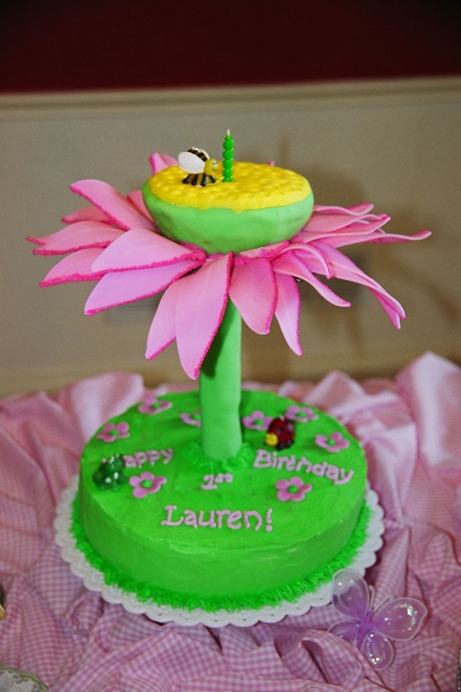 I made this for my daughter's first birthday. bottom cake is buttercream, top cake is covered in fondant and resting on a cake tier (screwed into the supporting column - also covered in fondant). leaves are fondant with the edges dipped in hot pink sugar ( I let them dry several days in advance) also made her a tiny "companion cake" to eat with her hands.