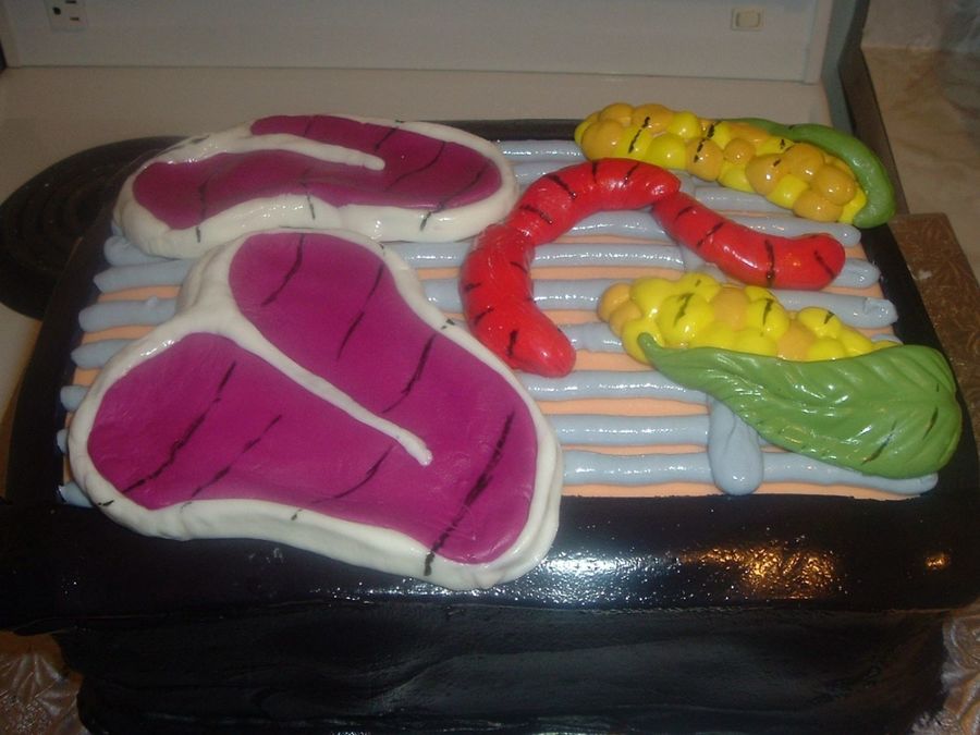 This is my first attempt at a BBQ cake which was inspired by the ones I had seen on this site...the cake was 3 layered with butter pecan cake, vanilla pudding, chocolate cake, vanilla pudding and butter pecan for the bottom..it was covered in mmf...the veggies and sausage links are mmf as well.