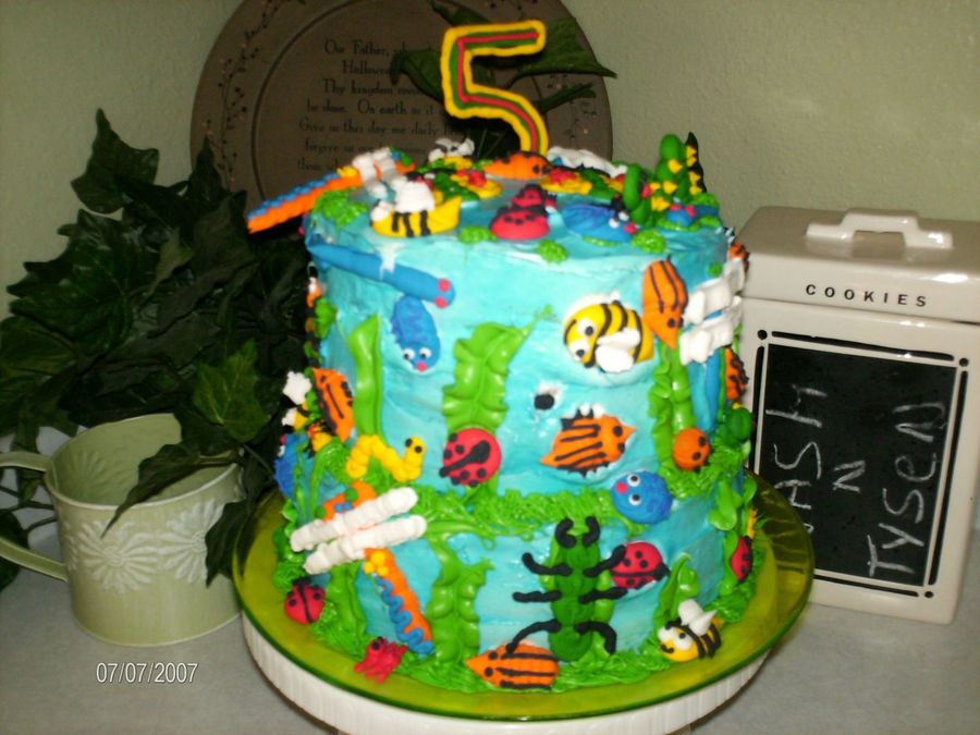 This was done for my little 'bug collector's' 5th birthday. I would not have been able to do this without all the wonderful help from my3girlies, Thank you so much!! The bugs are all royal icing and were alot of fun to make, only my hand was a little sore by the end of the night :) I have to say the picture doesn't give the cake justice, it looked better in person and was a big hit. Thanks again my3girlies! :)