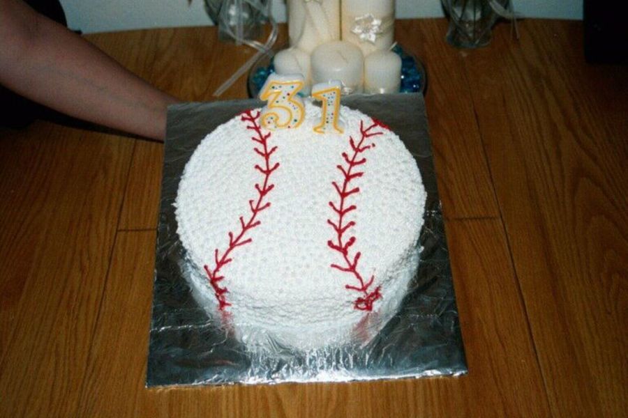 I made this cake for my husband's birthday. He loves baseball and softball adn plays both. I just "stared" the butter cream on then piped the threads...