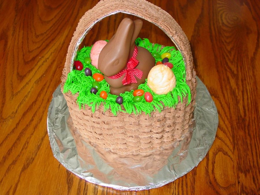 This is an Easter basket cake I made for Easter 2006. Turned out pretty good but I think I would do the "handle" differently. I wrapped cardboard in foil and frosted the top buttercream.