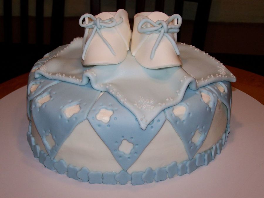 Cake frosted in BC, decorated with fondant/gumpaste. Baby Booties made from fondant/gumpaste, directions found on CC forum. Blanket corners have baby's name, weight, length and birth date.