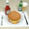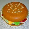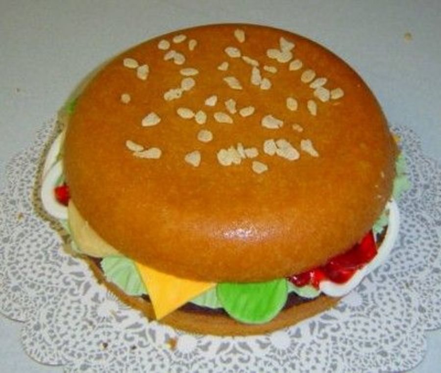 White cake was used for the bun, brownie for the patty, fondant for the onions, letuce, and pickles, various fillings for condiments, and Rice Crispies for sesame seeds.