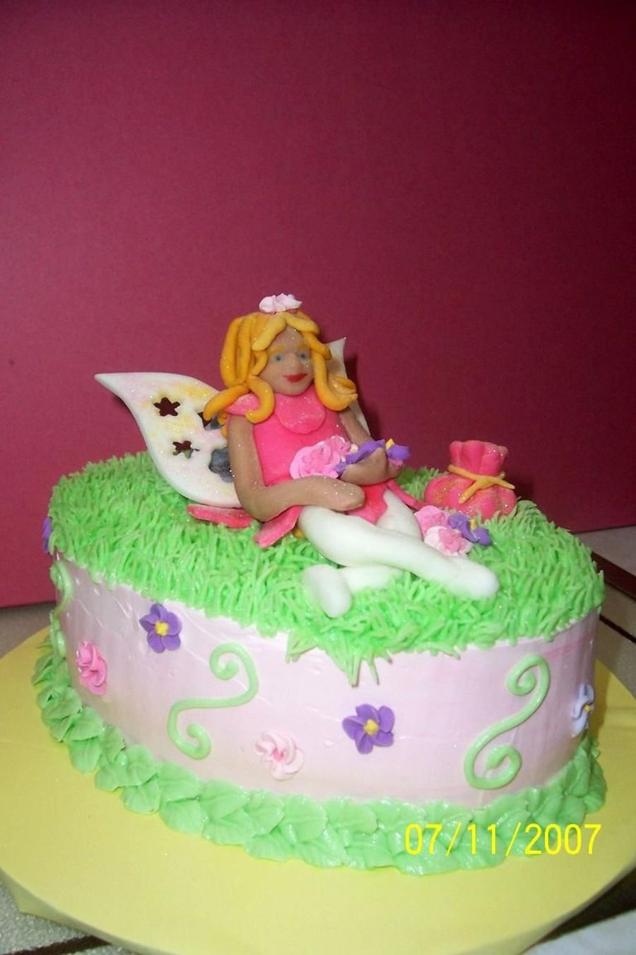 Handmade fondant fairy resting on fondant rock. BC grass. Marshmallow Whipped frosting and BC leaves. RI drop flowers. Strawberries n Cream filled yellow cake.