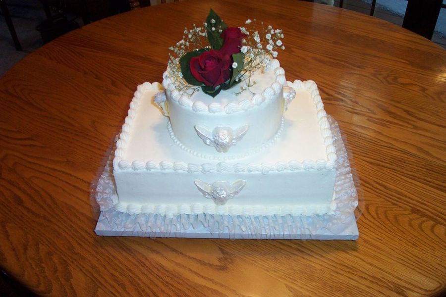 I wanted to make an elegant birthday cake for a friend. The Cherubs are white chocolate covered with pearl juster dust. The top layer is rimmed with candy pearls.