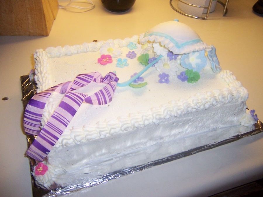 this cake was ordered 1 1/2 day before the shower, it would come out nicer if I had more time for the decoration. they requested a whipped cream frosting with raspberry cream filling on a half sheet cake