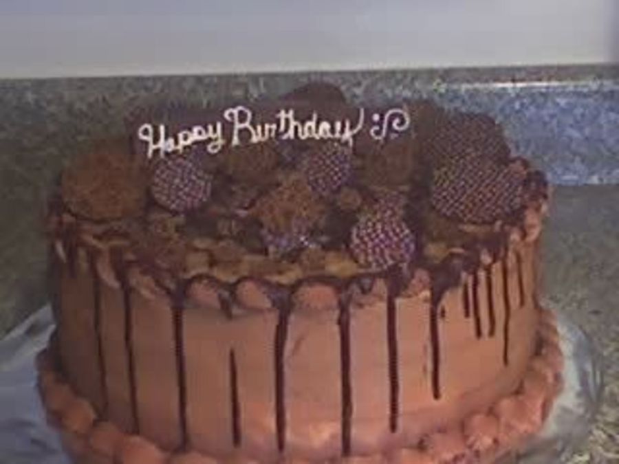 This was done for my bosses father.. He loves German Choc Cake. 3 Layer cake with Pecan Coconut frosting in all the layers and the top outside done in choc buttercream. Decorated with choc drizzle, and choc circles on the top.