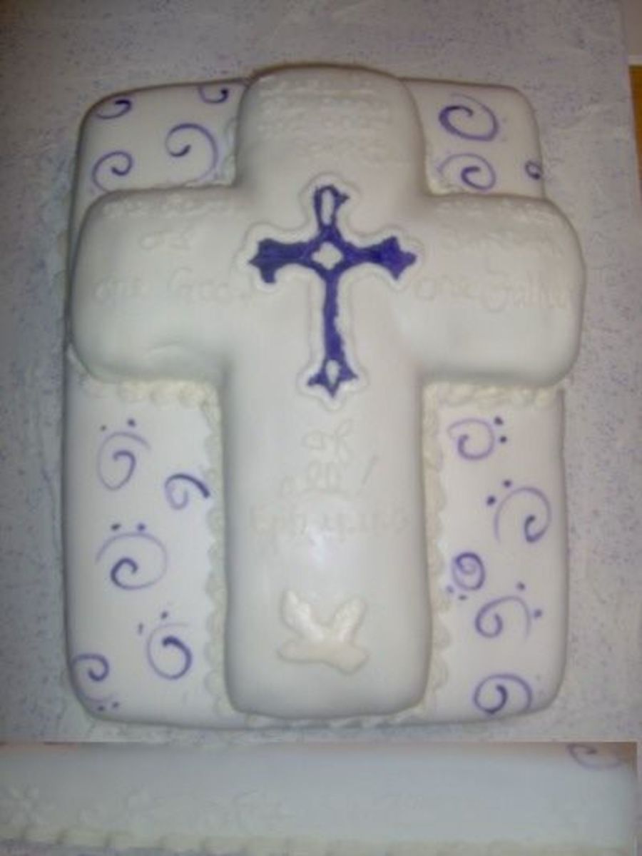 It is hard to see, but I added in a picture of the side of the cake.It is a flower and leaf pattern that is stenciled on there in frosting.The cross is painted in with food coloring mixed with almond extract. Same with the swirls.The writing on the cross says: There is one body, and one Spirit, one Lord, one faith, one Baptism, one God, one Father, of all. Eph 4:4-6 It is abreviated from the full verses, for obvious logistic reasons.