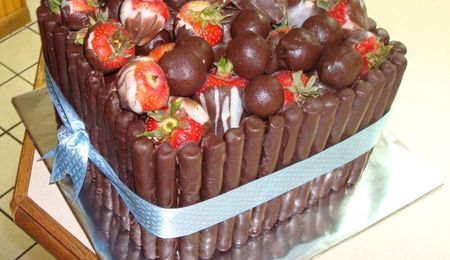 2 of the 3 satellite cakes I did The white one is a scratch carrot cake with cream cheese icing. the 12x18 is a white almond sour cream cake with buttercream and vanilla waffer crumbs. All the shells are chocolate and luster dusted. The slab cake says "Terry and Shelly" on it that I wrote in the crumbs with my covered finger to make it look like it was wrote on sand. ignore the clutter please, for some reason my DH takes photos at the worst possable time.