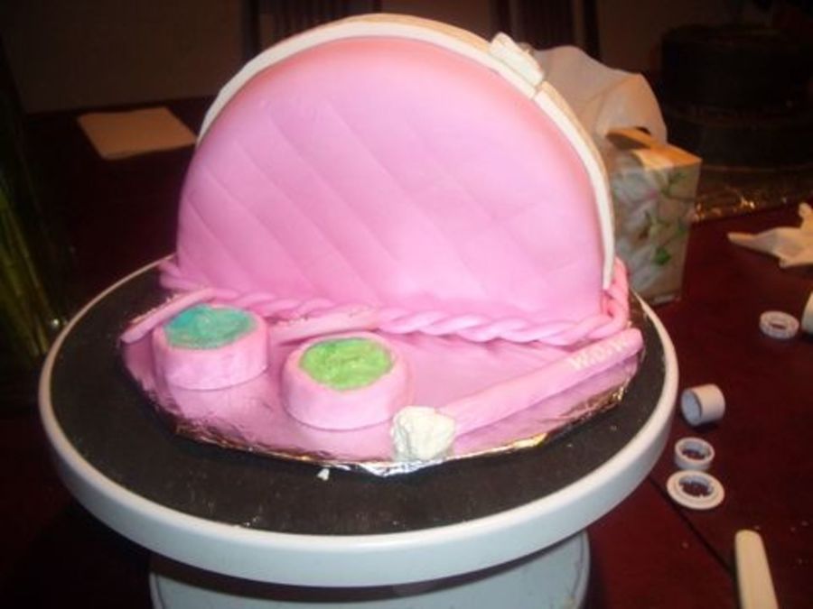 Front view of Make up bag cake. Many thanks to Nati for her tutorial. The MMF was impossible to work with, luckily you can't see the back! Everyone loved the cake