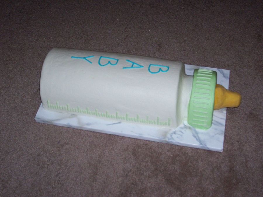 THis baby bottle cake was made with 3 6" round cakes, 1 4" round canke and 1 5" round cake. The nipple is made from rice krispie treats and covered in fondant. The bottle is frosted in BC