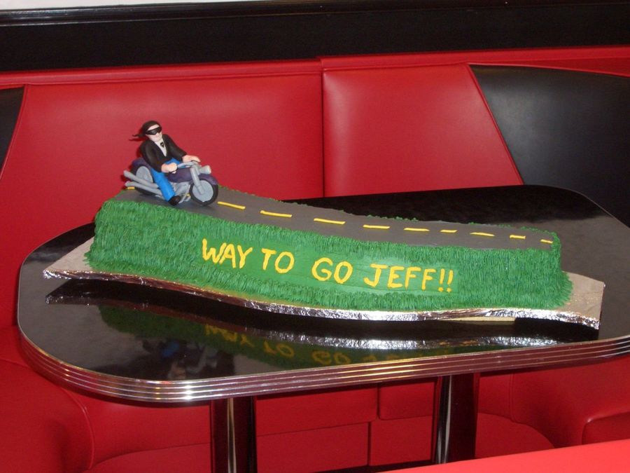 Cake made in celebration of a major accomplishment by my brother, an avid Harley Davidson rider. Road and grass are butter cream. Figure and bike are fondant supported with popscicle sticks built into the wheels and motorcycle engine. Whole shebang measured 32" from end to end. The cake was meant to symbolize an open road ahead of him.