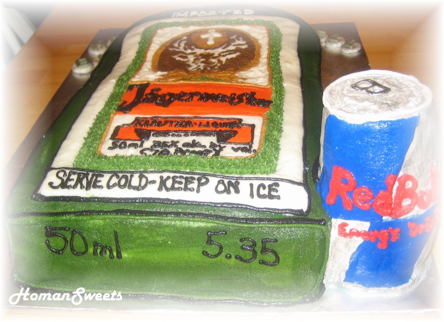 4 8" square cakes(double layered next to each other), carved on the top... Red Bull is 3 cupcakes......all bc.