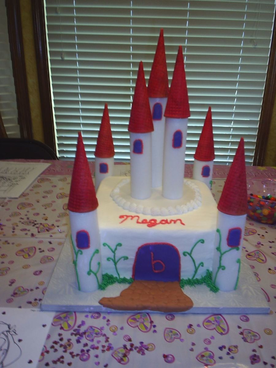 Marble cake iced in buttercream with Styrafoam towers. fondant windows and path.