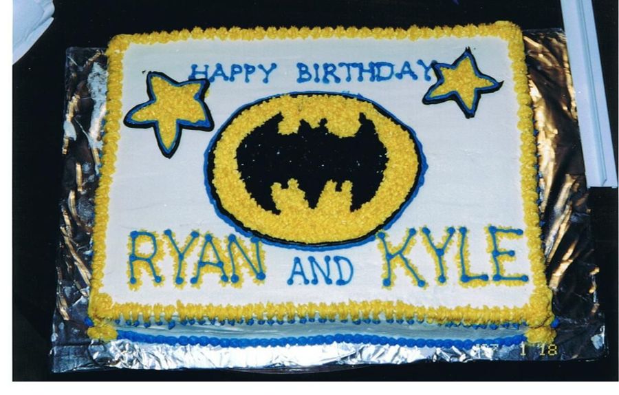 two-layer, 9x13 in cake, buttercream frosting, freehand lettering