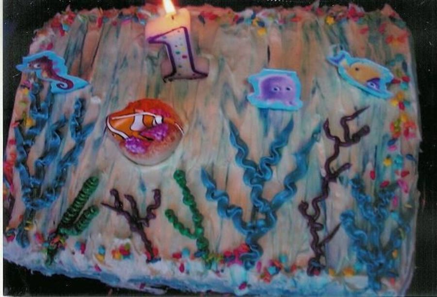 This is my son's first birthday cake; a double chocolate chip cake with cream cheese frosting. I purchased the Nemo set from a local bake shop. And piped the rest once I iced the cake. He loved it.