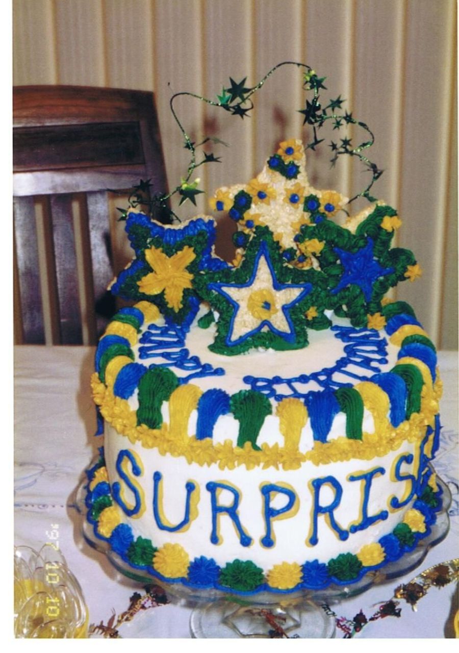 b-day cake for my mom's surprise party. the star accents are made of rice krispy treats. 3-layer 10 in. chocolate cake, all buttercream frosting, freehand lettering.