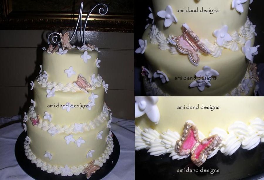 Covered in yellow fondant, with gumpaste butterflies and flowers. Accented in gold, but bride accidentally bought a silver monogram. Looked pretty good though.