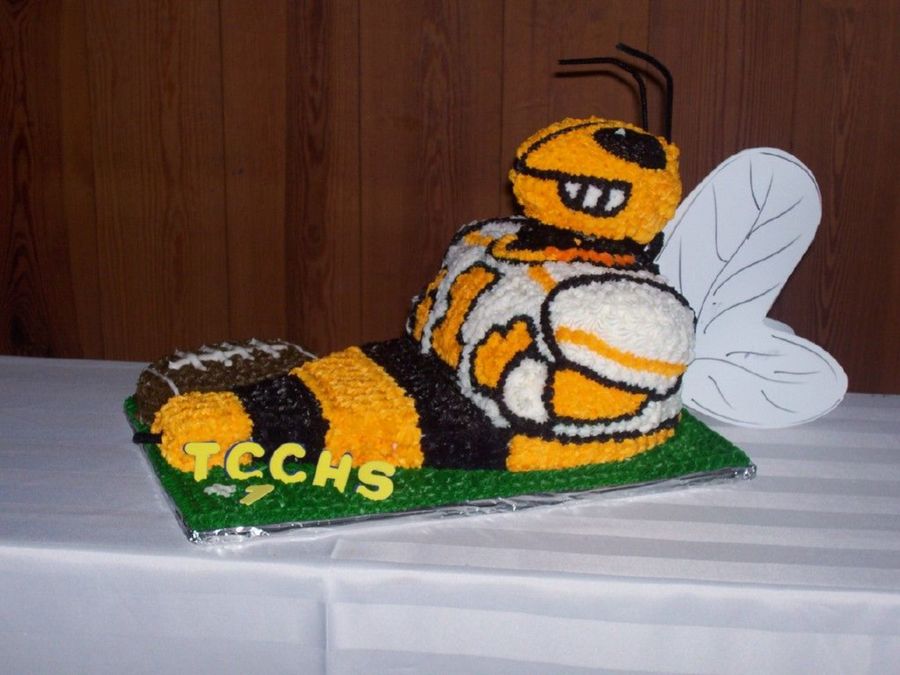 I did this with permission from the Cake Lady in Macon, GA, My version is smaller. The Groom loves our hometown Yellow Jackets!! It was a gift to him from his bride!! The cake was all white with BC icing all edible except the head is syrofoam and the wings are foam board. Needless to say He love it!!