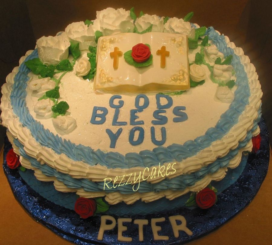 This cake is not at all what I planned. I baked a small book cake to put on top but it fell apart! Oh well. I used white candy melts instead. And since it was whipped icing on top, once I had the letters down, I couldn't move them around so the writing looks kind of sloppy. The cake is whipped icing, fondant bottom border, chocolate bible, whipped & RI flowers, fondant writing.