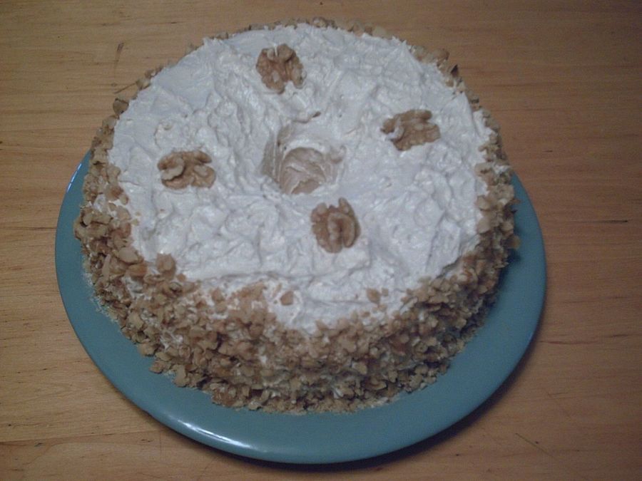 This is a yellow cake with Maple flavored Buttercream icing and walnuts around the sides.