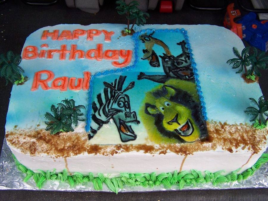 I used 3/4 sheet with rounded corners for this cake. Top layer was chocolate and lower was vanilla with dulce de leche filling. Icing was Pasty Pride and used the Madagascar picture for the image, added palm trees, brown sugar for the sand and grass with tip 18 in green buttercream.