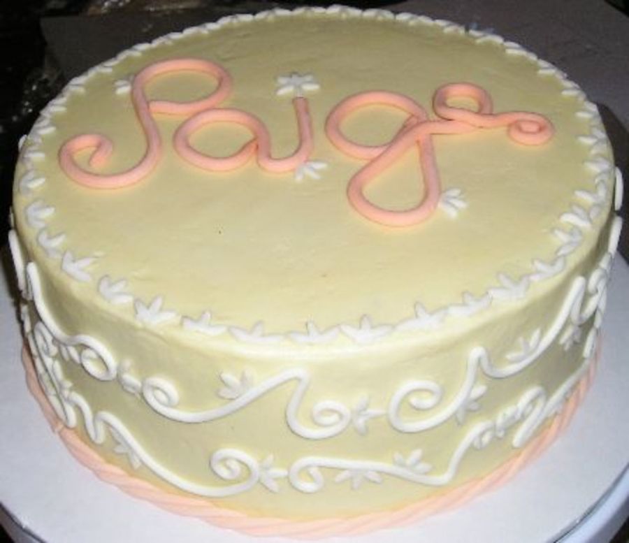 9 inch round white chocolate cake with pumplin white chocolate cream cheese filling & buttercream icing with candy clay swirls