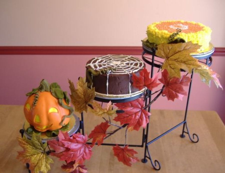 These are for a party tonight. The jack-o-lantern is pumpkin cake with carmel filling and Easy MMF, the spider web is double chocolate with whipped ganache and the candy corn cake is white cake with candy corn colors Carmel Praline creamer filling and iced with BC