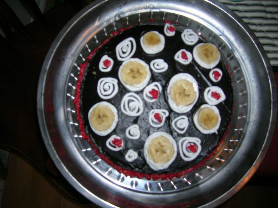 banana cake with swirly decoration, banana slices for added touch. all buttercream.