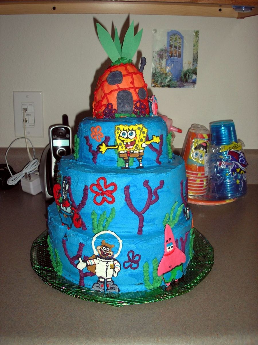 This is my first stacked cake. It was a challenge. It was also my first layered/torted cake. Bottom tier is chocolate w/BC filling. Middle tier is white cake w/BC filling. The top tier and the pineapple are krispie treats. All iced in BC. The characters are royal icing transfers.