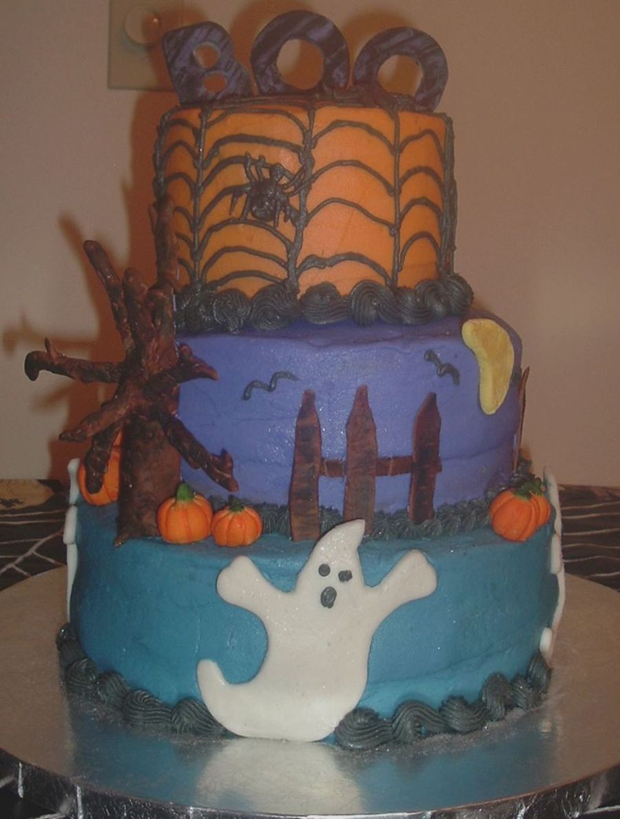 Three tier cake with different Halloween scenes. Fondant pumpkins, ghosts, tree. All iced in buttercream.