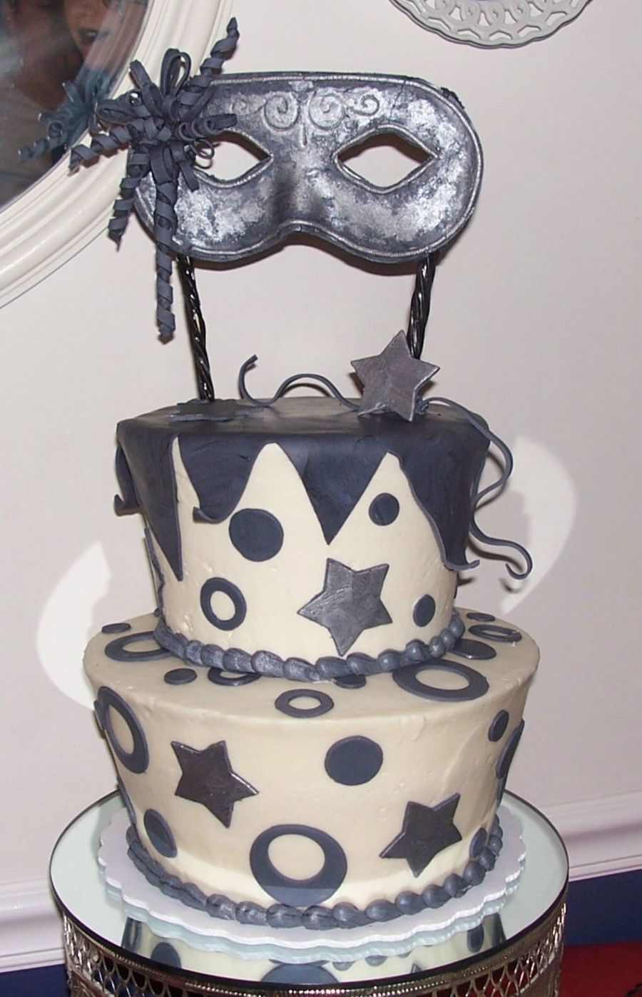 THIS CAKE WAS MADE FOR MY DAUGHTERS HALLOWEEN COSTUME PARTY. THE MASK IS FONDANT WITH SILVER LUSTER DUST AND FONDANT CURLS (BY THE WAY I COVERED THE SKEWERS TO HOLD UP THE MASK WITH BLACK LICORICE). THE CAKE WAS RED VELVET WITH CREAM CHEESE ICING AND FONDANT CIRCLES AND STARS. THIS WAS MY FIRST ATTEMPT AT THE TAPERED CAKES.