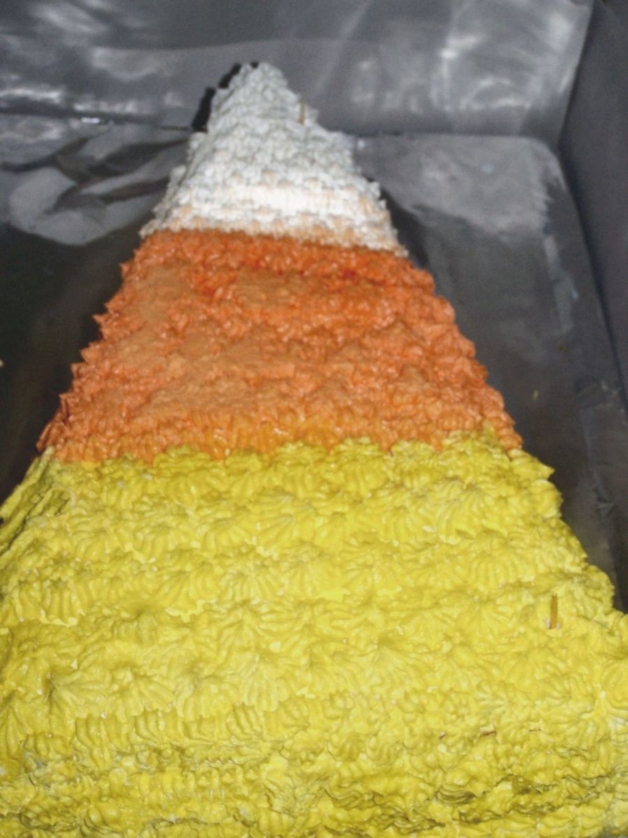 This is a golden buttercake w/ almond buttercream frosting. The cake was made for a cakewalk at our church Harvest Party. Instead of colouring the frosting I left it white, and bought some orange and yellow coloured food spray and sprayed the cake. I did the spray outside, and being that it was windy, the colouring was blown onto the white part. I had fun making this cake though.