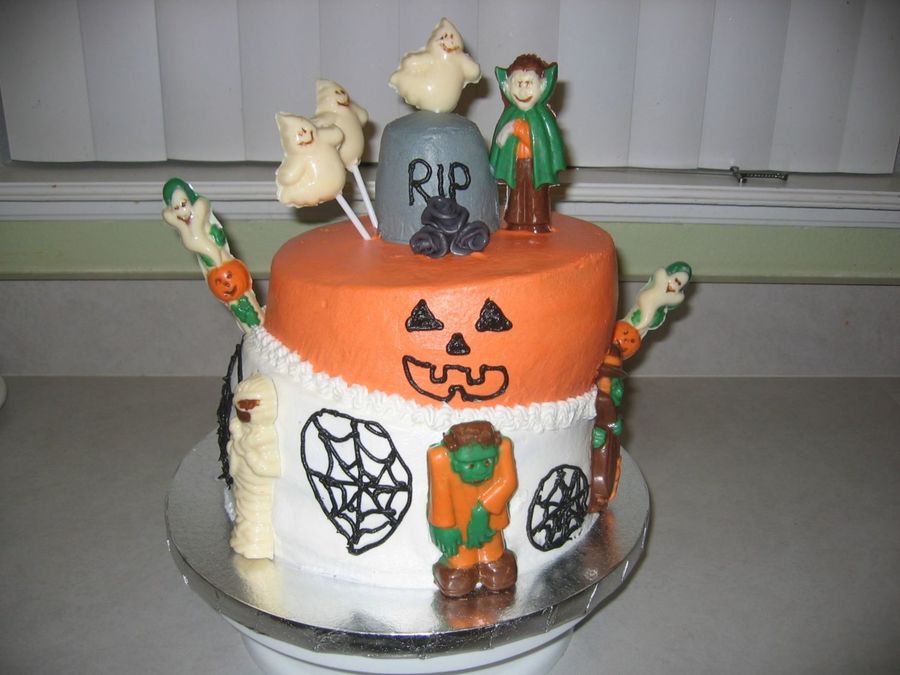 1st halloween cake, 1st stacked cake & 1st topsy turvy cake. 9'' chocolate with cookies & cream filling, 8'' cinnamon swirl with whipped cream buttercream filling & scratch cake as tombstone. Frosted with whipped cream buttercream, fondant roses and chocolate figures.