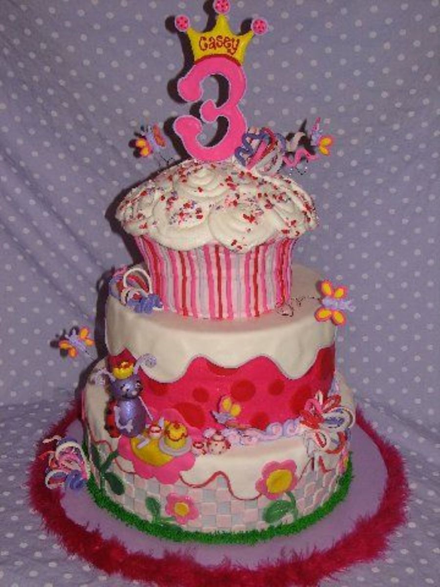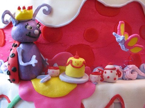 Here is my daughter's 3rd birthday cake. It was done to match the princess lady bug partyware. Buttercream with fondant accents and molding fondant characters with royal icing butterflies and 3 topper.